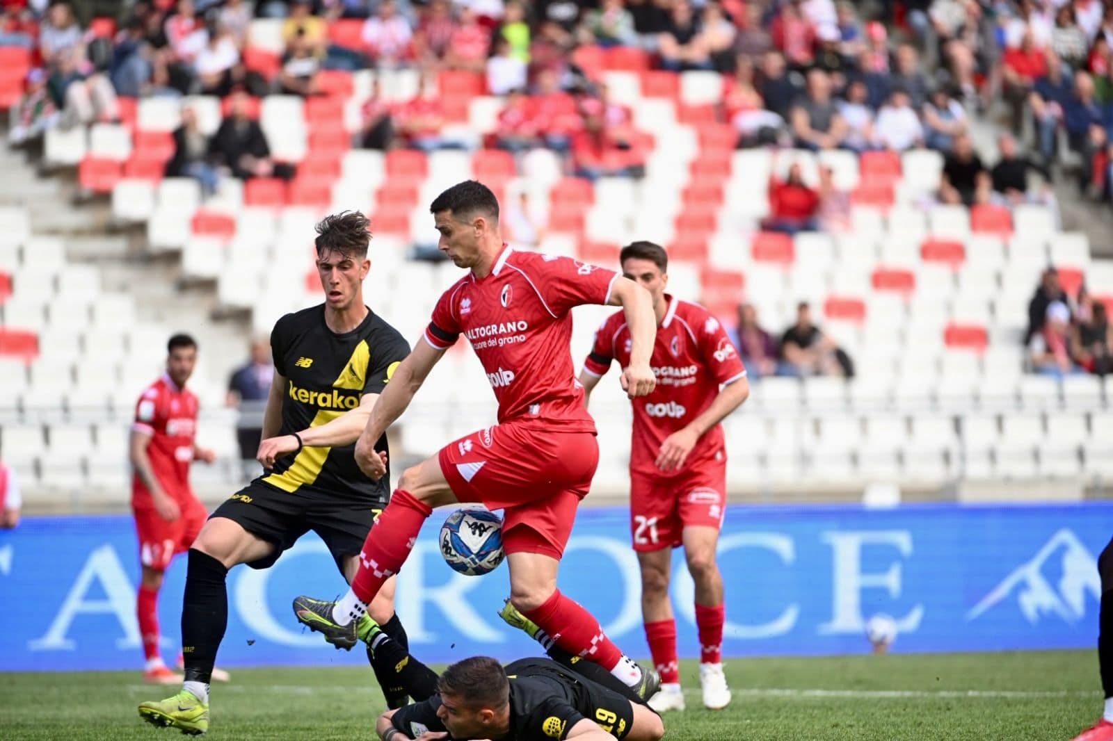 All’8′ Defrel firma l’1-0 su tirocross di capitan Gerli; dieci minuti dopo, un Maita poco scaltro concede il calcio di rigore agli ospiti in seguito ad un lampante fallo in area ai danni di Palumbo che a sua volta segna la sua nona rete in campionato.